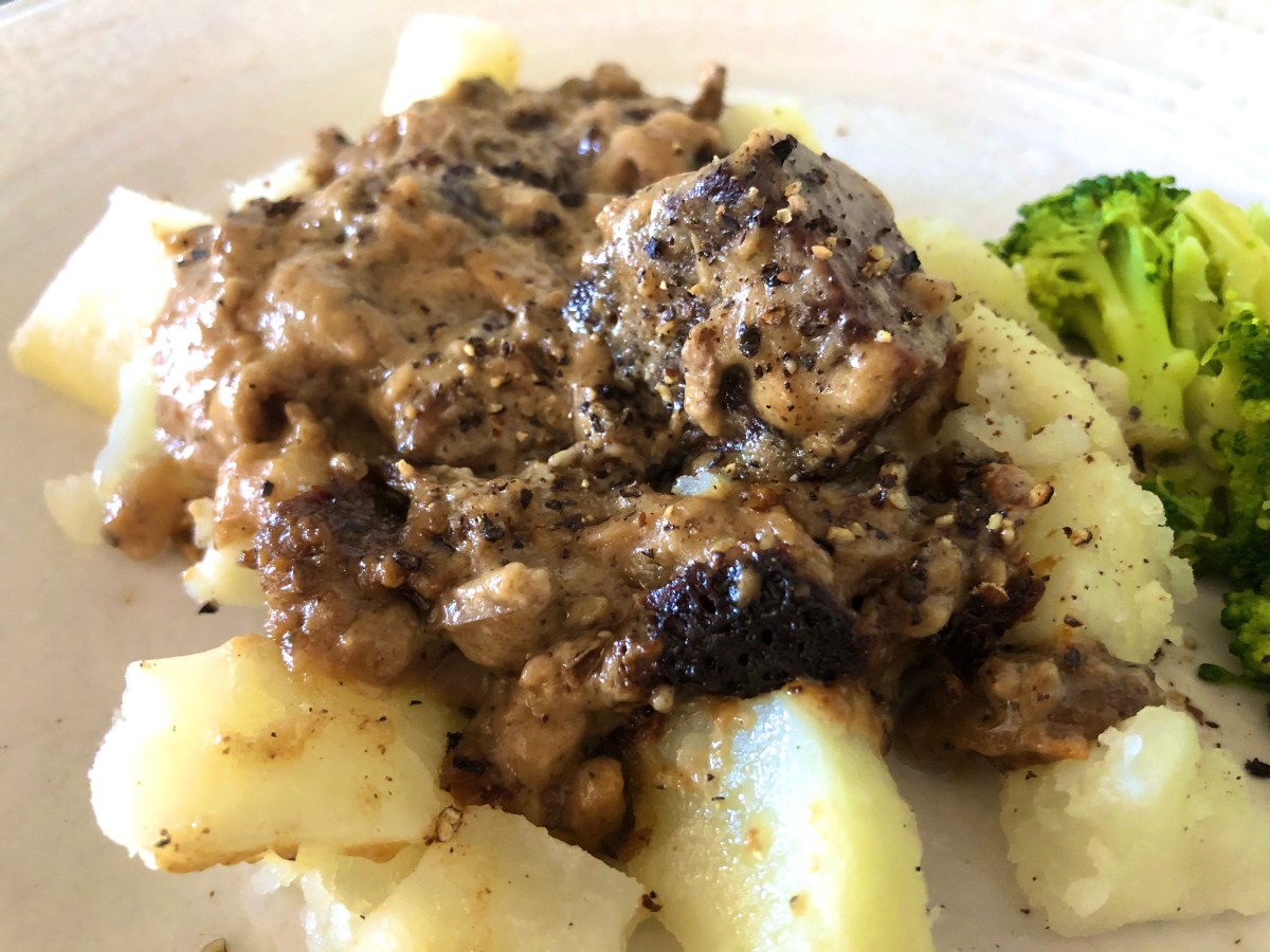 Once the cubes are golden brown on all sides, add to the crockpot with cream of mushroom soup and turn to low heat.