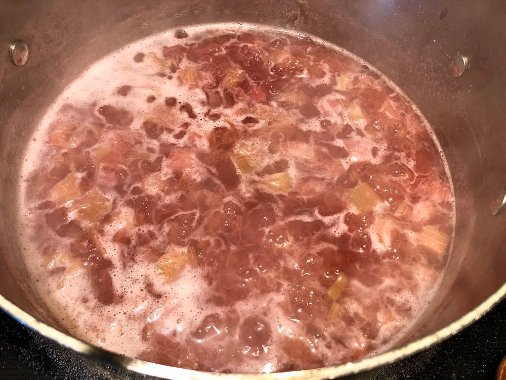 Chop 4 cups rhubarb and add to pot with 4 cups boiling water.