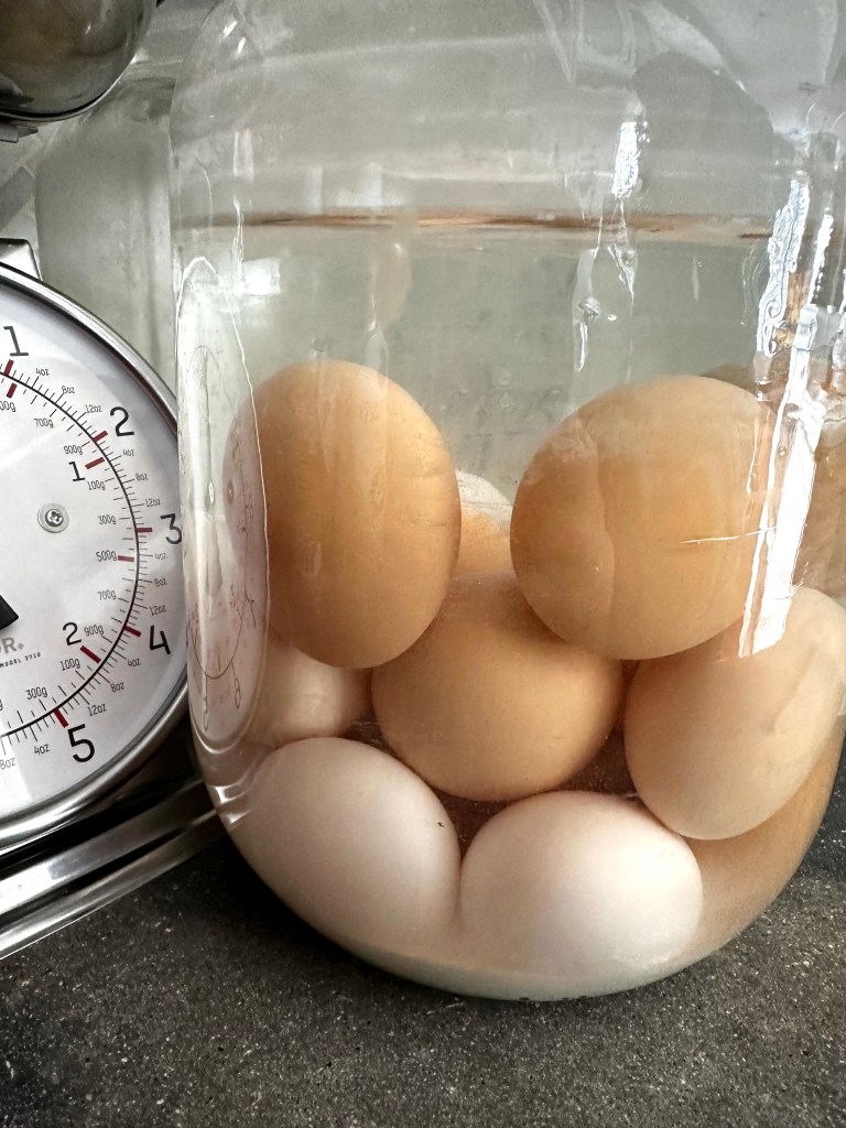 Which brings me to another important point; you want to make sure the eggs are completely covered by the pickling lime solution.
