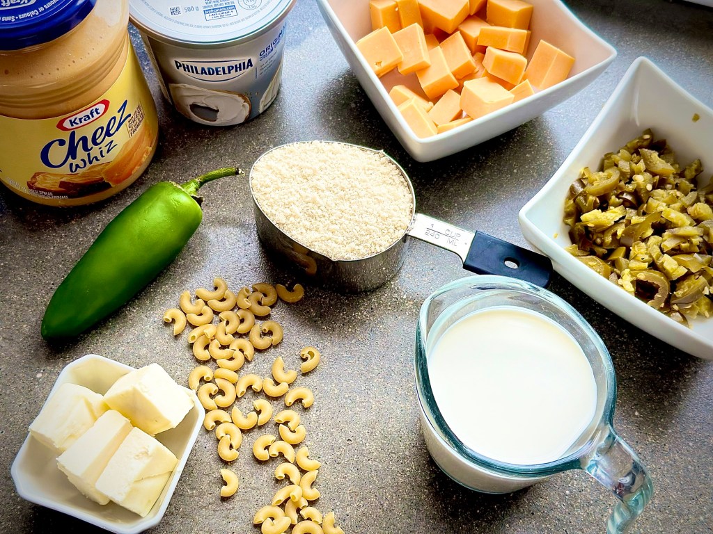 Use the pot you had cooked the noodles in and add your heavy cream, cream cheese, cheese whiz, and cheddar cheese, as well as your chopped jalapeños.