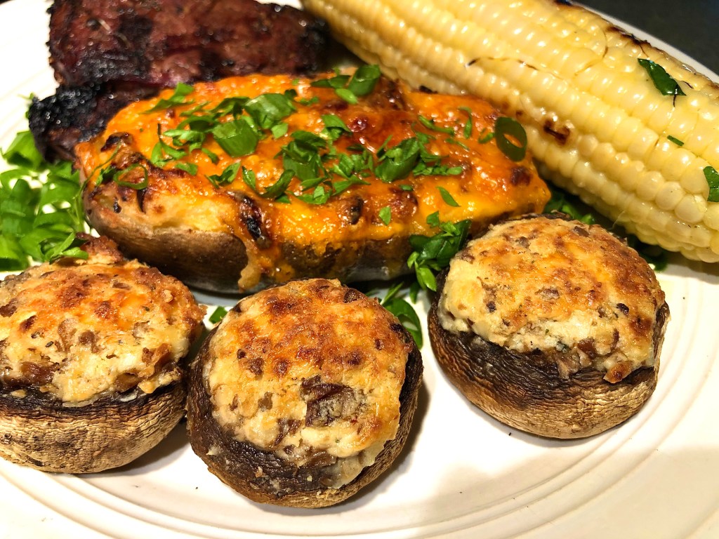 These stuffed mushrooms go well with my loaded stuffed potatoes, premium roast beef, and grilled corn on the cob as a side if you choose to serve them with your meal rather than as an appetizer.
