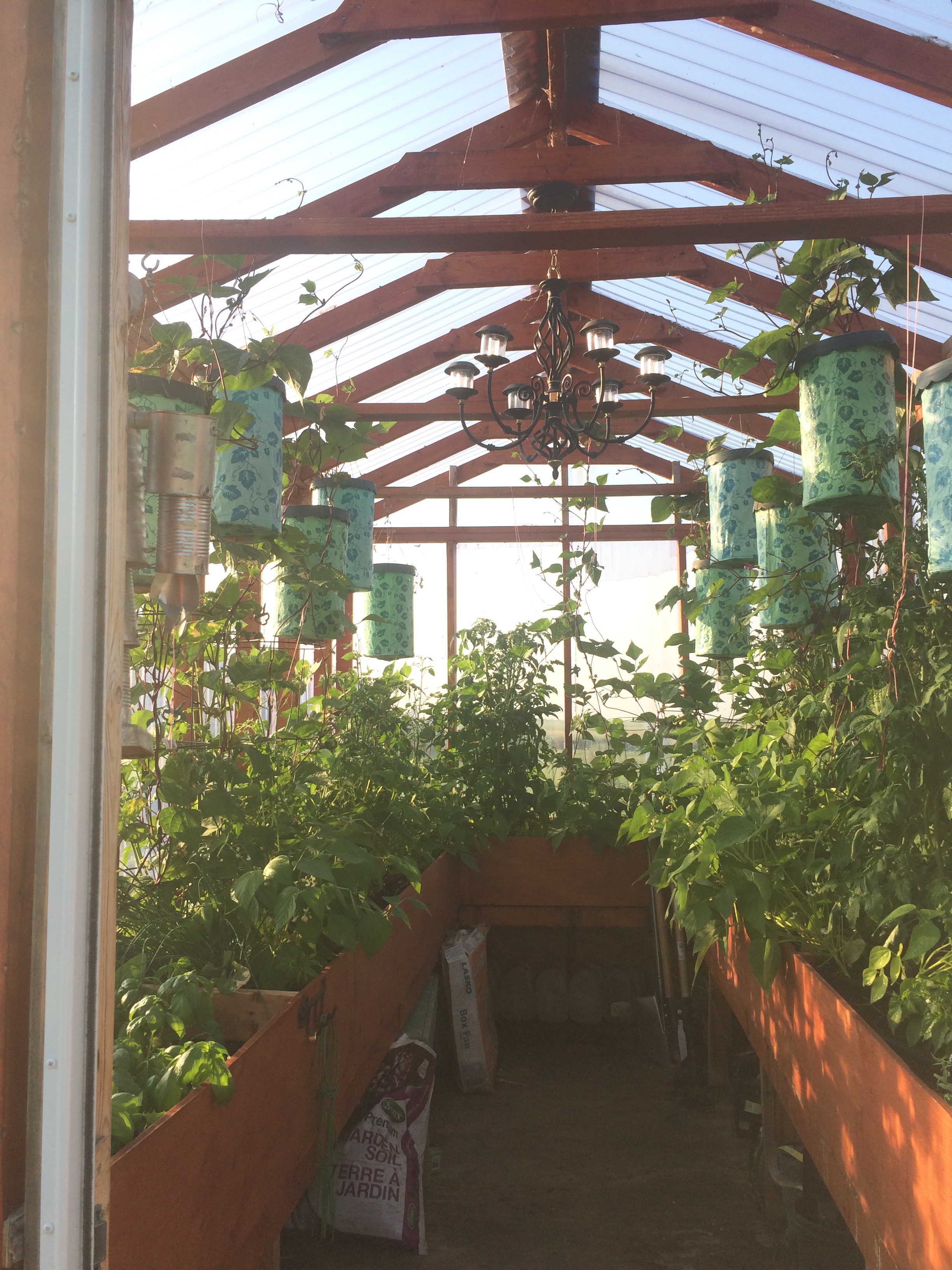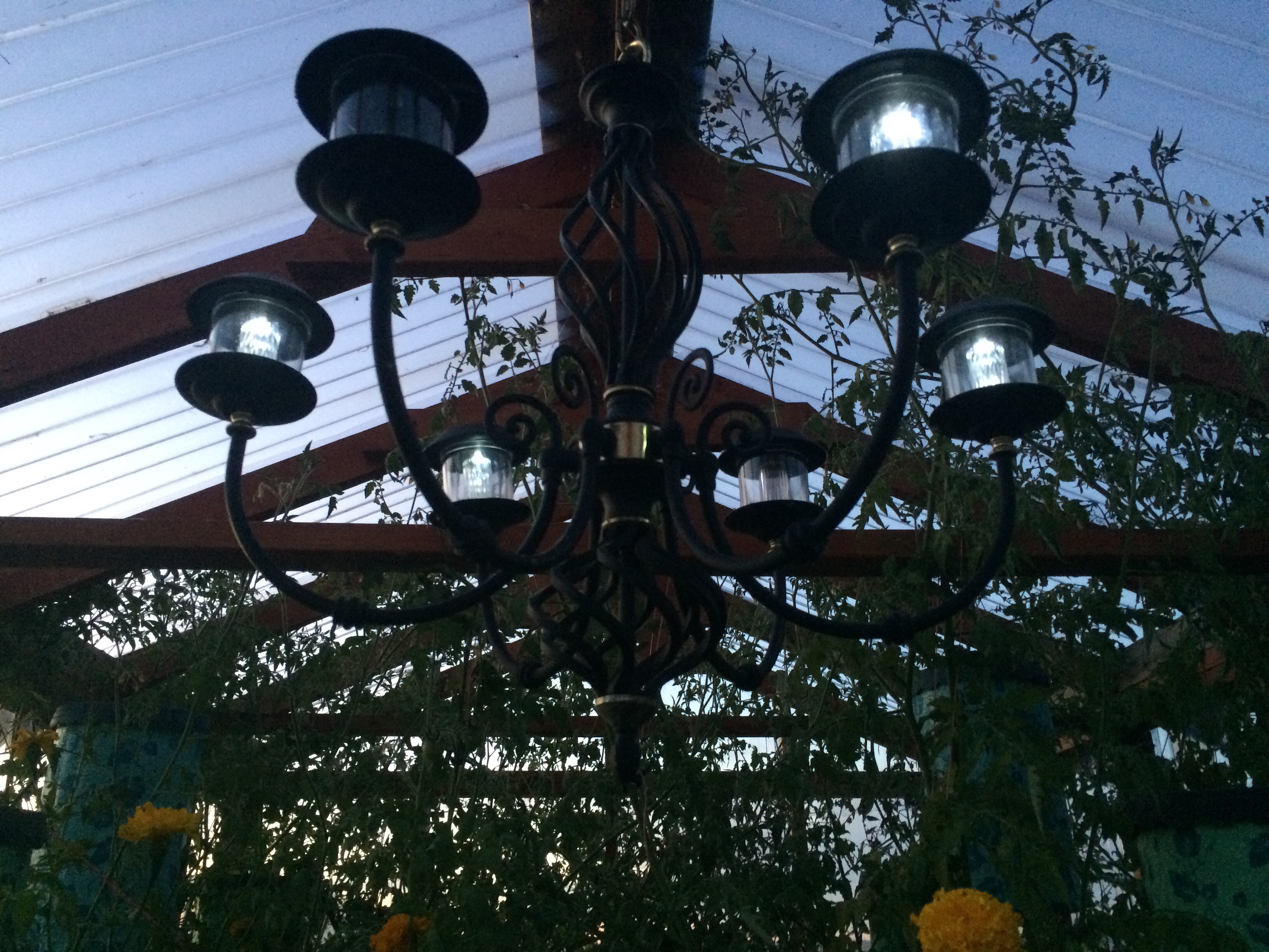 During the late summer, my scarlet pole beans get so tall they end up using the chandelier as though it were their trellis, reaching ever higher for the sunshine.