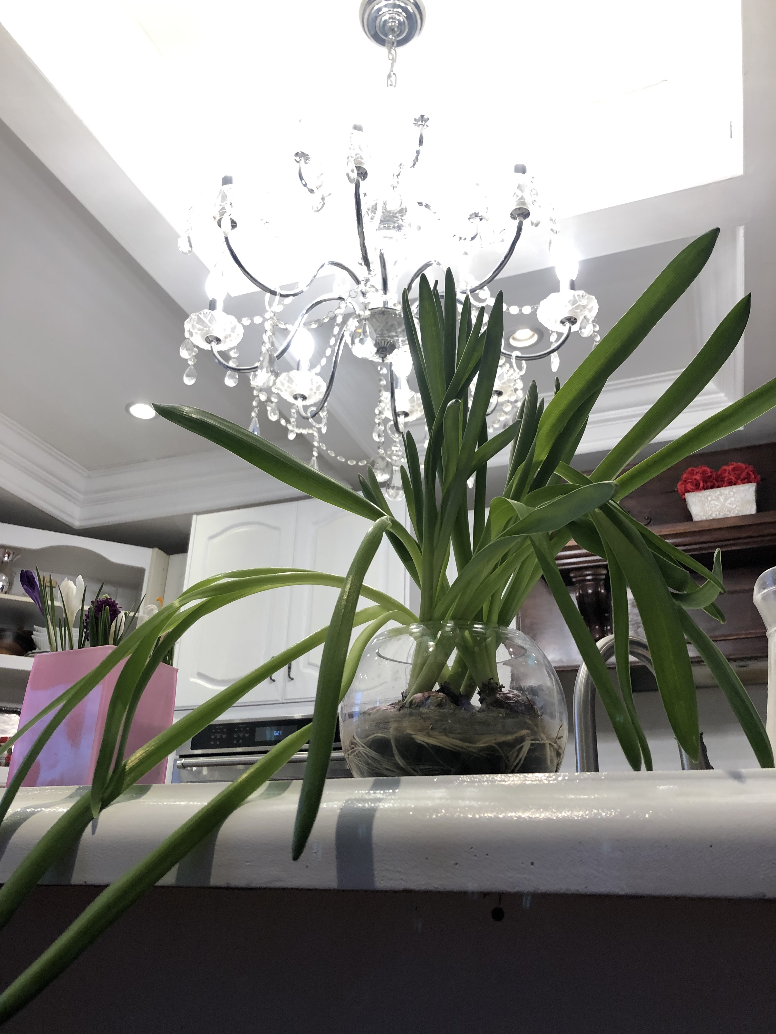 The next stage is taking care of the bulbs after the flowers have dried up. I trimmed the dead flowers off; right now, my first set of forced bulbs still have beautiful green leaves – even without the flowers they add a refreshing color to the house.