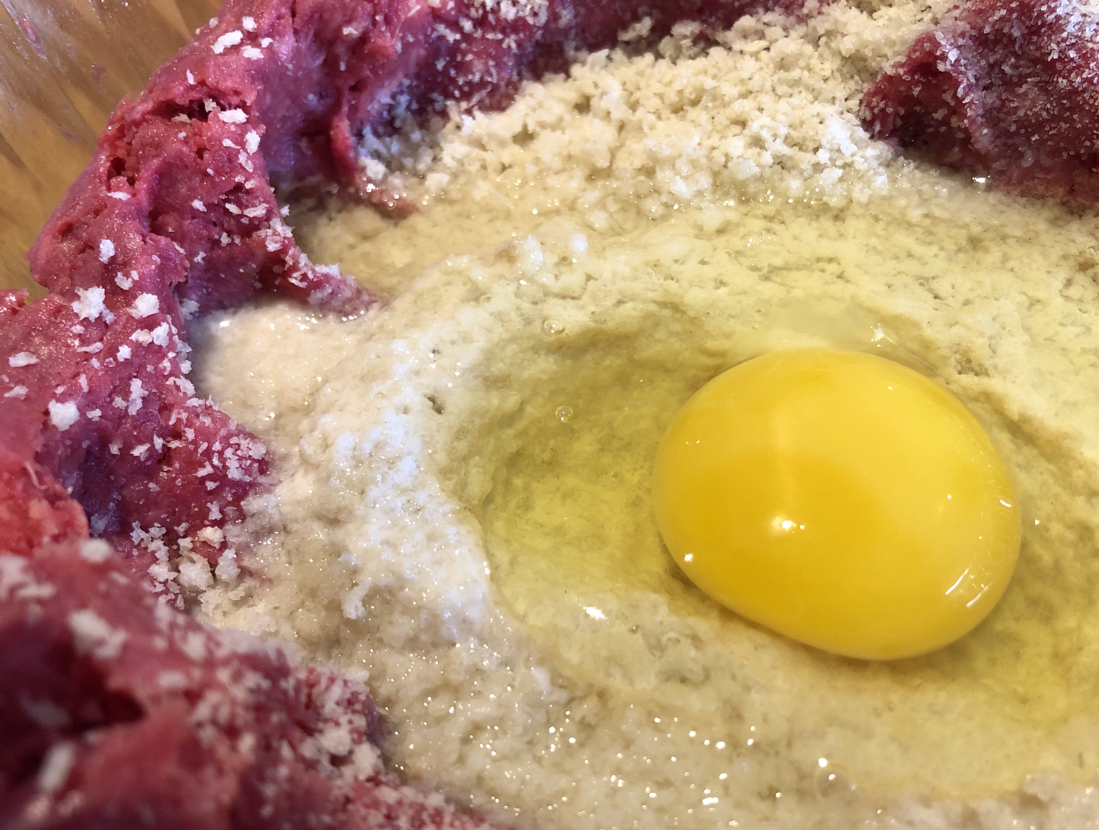 I add the ground beef to my mixing bowl and make a well in the middle, then add the bread crumbs and milk and let them sit until the bread crumbs have absorbed all the milk.