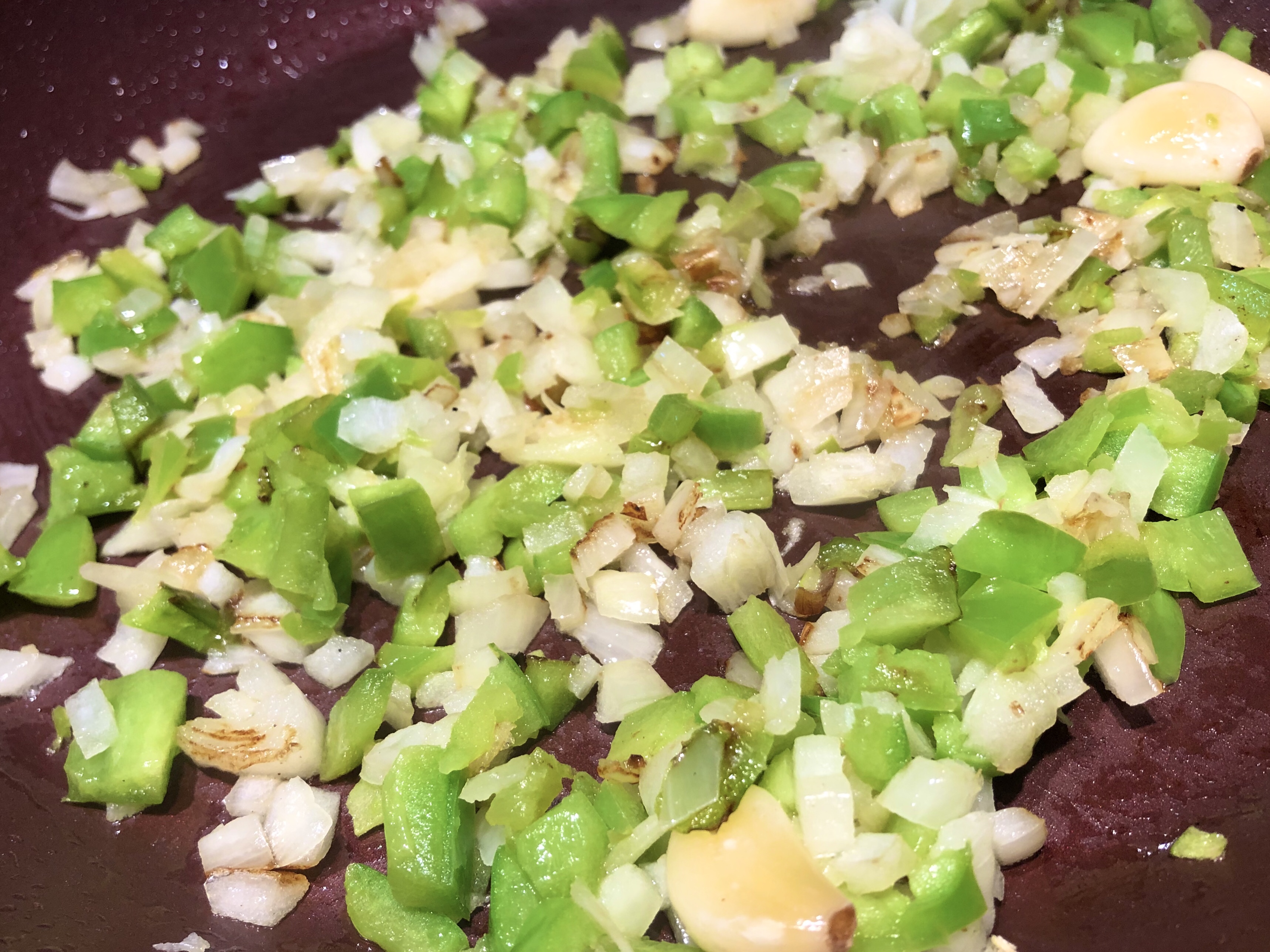 Next, I add the egg to the bowl while I sauté the finely chopped onion, bell pepper, and garlic until soft.