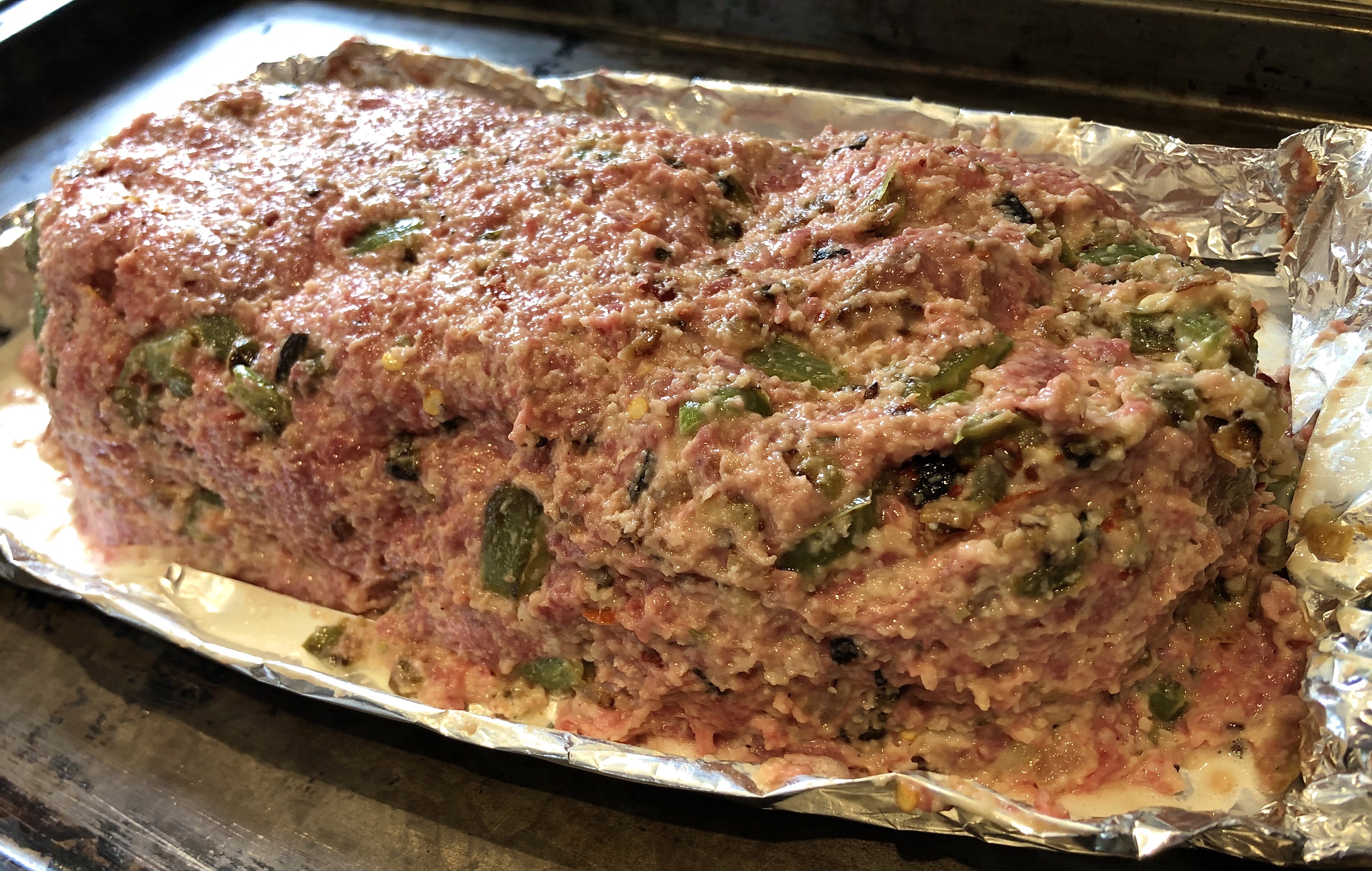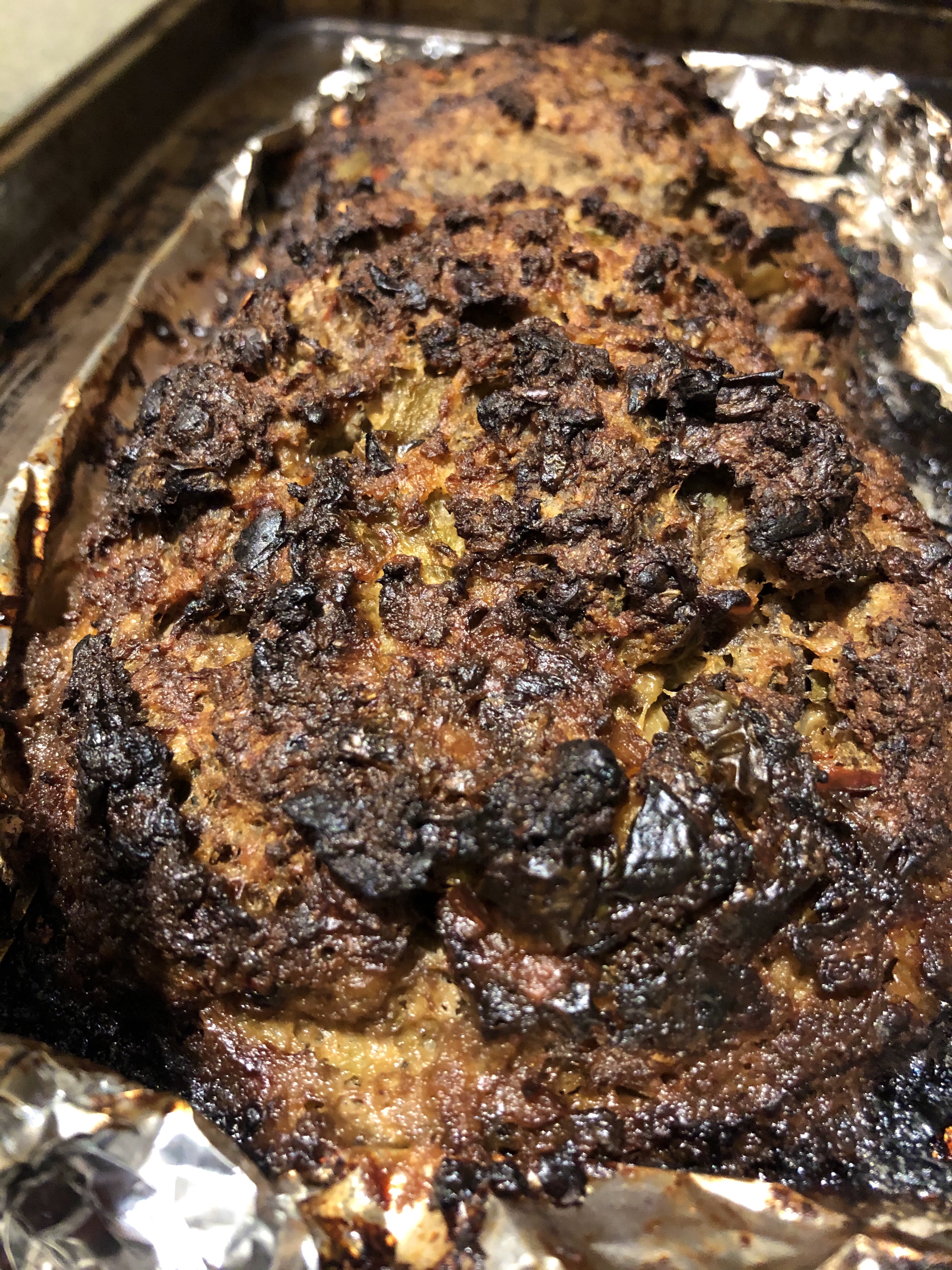 Shape the mixture into a loaf and place in the pre-heated oven at 375º for 45 minutes or until internal temperature reaches 160º and is golden brown (I often bake until it is a bit crispier than that).